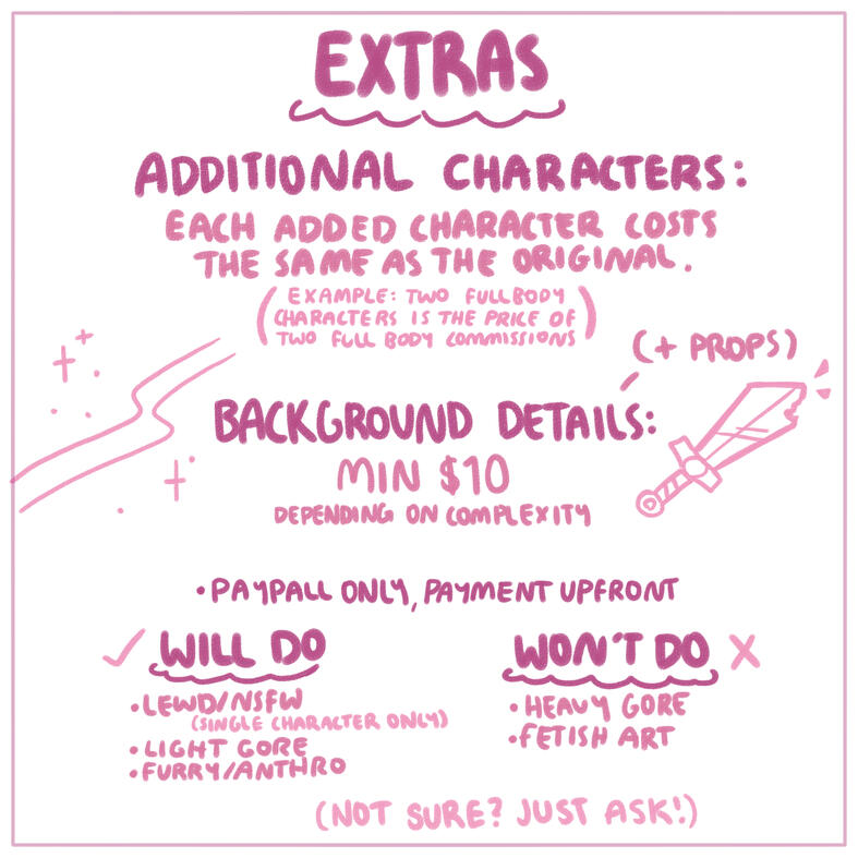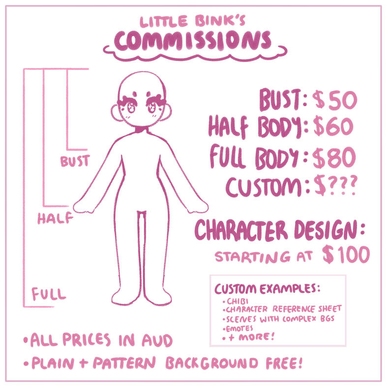 - All prices are listed in AUD (Australian Dollars) unless it is a commission listed on Ko-fi. Ko-fi commissions are listed in USD (United States Dollars).