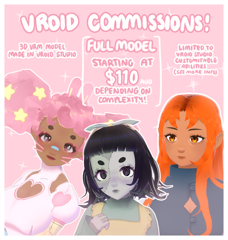 - Vroid models will be interpreted by myself, as the artist, with the guidance of the client. This means that I will implement my artistic style when making models, and will not work outside of my style of creation.